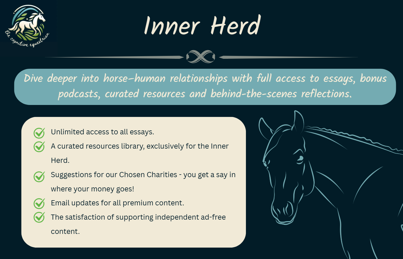 Inner Herd: £4/month or £40/year — gain full access to all essays, bonus podcast episodes, curated resources, early access to new content and behind-the-scenes reflections. And ultimately, the satisfaction of supporting independent ad-free creation for the equine community.